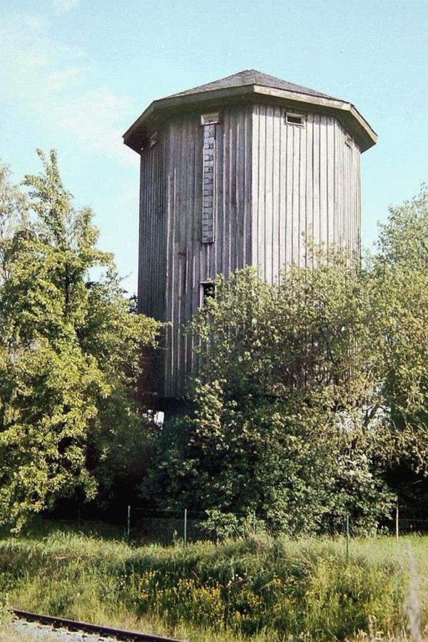 – Lange Zeit bestimmte der achteckige holzverkleidete Wasserturm die Südseite des Usinger Bahnhofs. Deutlich ist die Füllstandsanzeige erkennbar.