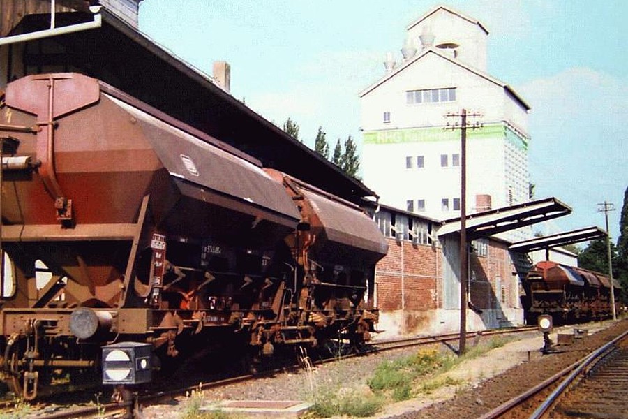 – Kein ernstzunehmender Kleinstadtbahnhof auf dem Lande kam früher ohne Raiffeisenlager aus! Hier stehen immerhin sechs Fcs-Selbstentladewaggons (für Getreide, Düngemittel o. ä.) im Ladegleis.
