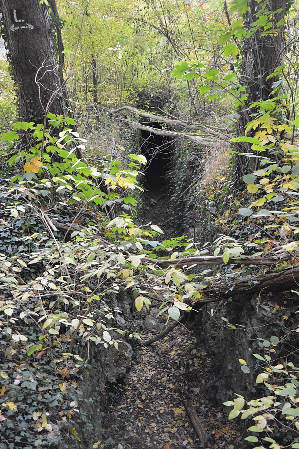 – Zwischen dem Eingang des Steinbruchs und der Eisenbahn führt ein schmaler ausgemauerter Graben hinunter zu einem Durchlass im Bahndamm.