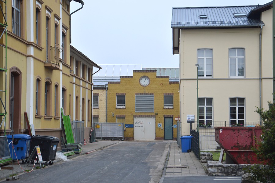 Der Blick geht über die alte Zufahrtstraße nach Südwesten. An der linken Seite das Verwaltungsgebäude II (1862), rechts das