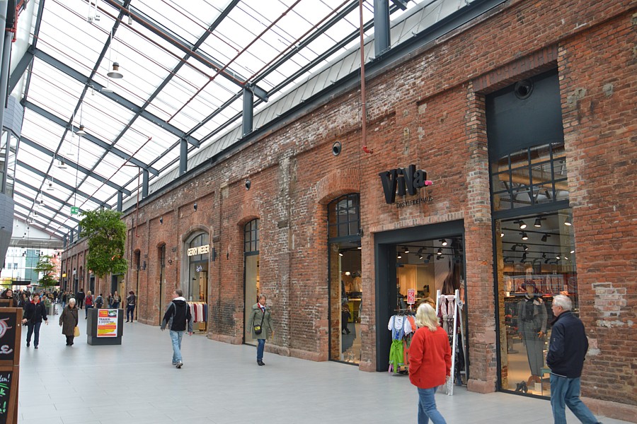 – Die gleiche Perspektive, zwei Jahre später; die Elektrowerkstatt ist Teil einer Ladenstraße geworden. Der rustikale Charakter des Backsteinbaus und auch die alte Wandgliederung wurden weitgehend erhalten.