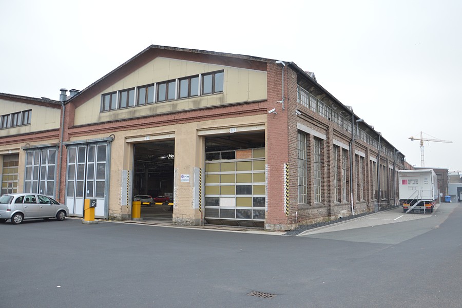 – Die Südecke der Richthalle I. In diesen Hallenbereich ist eine Parkgarage eingezogen, in die Tore der Gleise 5 bis 8 sind daher teilweise neue Tore und die Zufahrtschranke eingebaut.