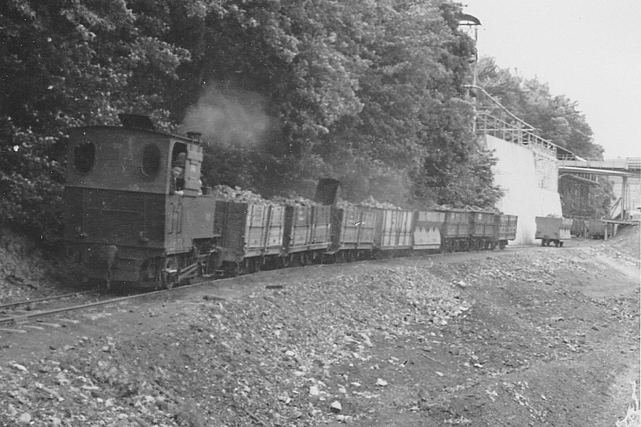Die Lok „Braunfels“ zieht einen Erzzug von der Verladestelle der Grube Bohnenberg in Richtung Braunfels;