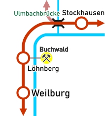 der das Feld 1887 (nach anderer Quelle 1897) an Fried. Krupp in Essen verkaufte. Nachdem der Abbau zunächst im Tagebau mit Kleinstollen erfolgt war, wurde 1906 bis 1909 ein 600 m langer Stollen vom Lahntal aus aufgefahren. 1927 nahm eine Tempererzaufbereitungsanlage auf dem Grubengelände den Betrieb auf. 1948 wurde die Grube aufgegeben; insgesamt waren seit 1906 ca. 373.000 t Roteisenstein gefördert worden. Eine Hängebrücke, die 1918 von Weilburg hierher versetzt wurde, verband die Grube mit dem Bahnhof und dient heute als Fuß-und Fahrradverbindung zwischen Löhnberg und dem anderen Lahnufer. Die Tagesanlagen der Grube dienten nach der Stilllegung als Wohnhäuser und stehen inzwischen seit vielen Jahren leer. |