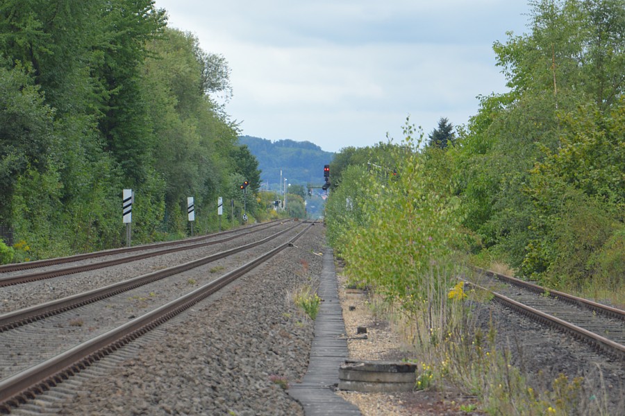 Der Blick in Richtung Westen zeigt links die beiden Streckengleise, rechts das Ausfahrtgleis der Anschlussstelle. Das