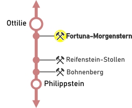 Der Fortuna-Morgenstern-Stollen wurde später auf über 1.000 m Länge nach Südosten verlängert und diente nun dem untertägigen Abbau des bei Philippstein gelegenen Kruppschen Grubenfeldes Eisenfeld, das bis 1897 im Tagebau abgebaut worden war. Am Mundloch entstand eine Aufbereitung und Bahnverladung zur Ernstbahn, zur Unterscheidung von der Verladung bei Philippstein auch „Alt-Eisenfeld“ genannt. 1926 wurde der Betrieb wegen zu starker Wasserzuflüsse aufgegeben. |