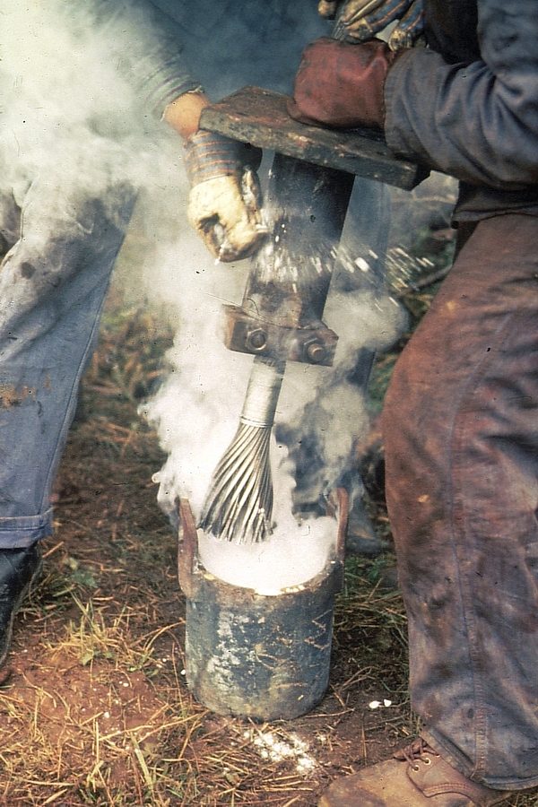 die Drähte gespreizt. Nun werde sie in flüssiges Zinn getaucht, um anschließend in der Muffe mit Zinn vergossen zu