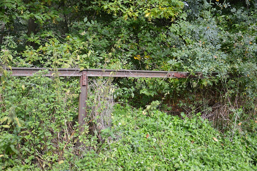 – Oberhalb der ehemaligen Verladeanlage (am Parkplatz des heutigen Grillplatzes) findet sich dieses aus Grubenbahn-Schienen zusammengeschraubte Geländer.