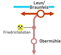 Auch das Abbaugebiet „Abendstern“, auf halber Strecke zwischen der Lahn und der Stadt Braunfels westlich des Iserbaches gelegen, gehörte zu dem großen Grubenfeld „Gut Glück“ das 1859 aus insgesamt 36 Grubenfeldern des Fürsten zu Solms-Braunfels zusammengefasst wurde. Der frühere Bergbau in diesem Gebiet lag seit ca. 1870 still. 1902 wurde der Abbau über den vom Talgrund aus neu angesetzten Friedrichstollen wieder aufgenommen, der 1909 eine Länge von 965 m erreichte. Seit 1905 war dieser Betrieb an die Union AG für Bergbau in Dortmund verpachtet; das Erz wurde direkt am Mundloch auf die Ernstbahn verladen. Am 1. 11. 1906 verkaufte der Fürst die Grube mit seinem gesamten übrigen Bergbesitz an Fried. Krupp in Essen. |