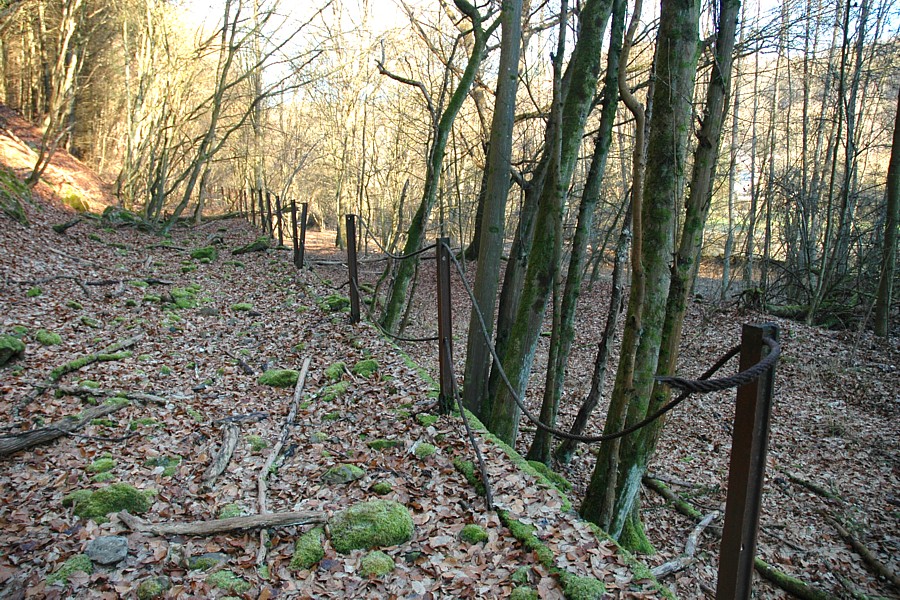 Die Trasse der Grubenbahn vom Stollenmundloch durch den Wald bis zur Brücke verläuft am Hang entlang, wird von einer