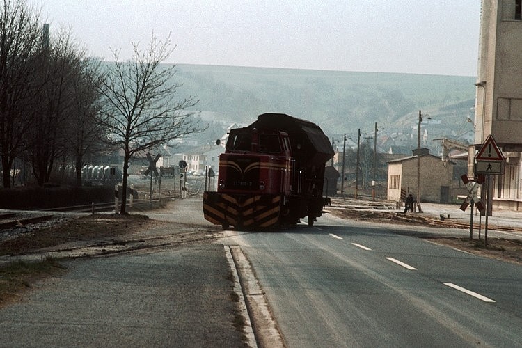 – Eine Übergabefahrt überquert die Landstraße Steeden – Dehrn zu Beginn der achtziger Jahre. Im Hintergrund links ist eine Reihe von Staubbehälterwagen im Anschlussgleis zum Lahnhafen erkennbar.