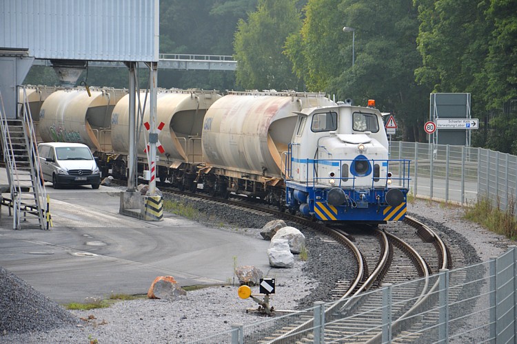 – Ein etwas näherer Blick auf die Deutz-Werkslok, die mit einem Zug Kalkwaggons im Werk rangiert.