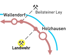 noch einige Jahre weiterbetrieben. Der Ton aus der Grube Landwehr wurde über eine Drahtseilbahn zur Verladestelle in km 10,7 der Ulmtalbahn befördert. 1968 wurde der Gleisanschluss stillgelegt und abgebaut. |