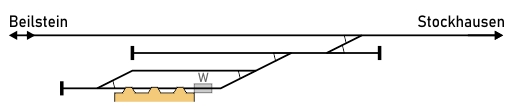 Tongrube endet, und einem Abstellgleis. Der Anschluss an die freie Strecke ist durch eine Schutzweiche gesichert.![]() ![]() |