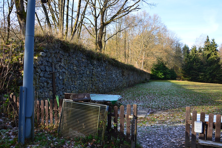 Das Gelände der Verladeanlage wird von einer mächtigen, aus Basalt errichteten Stützmauer dominiert. Hier dürfte sich