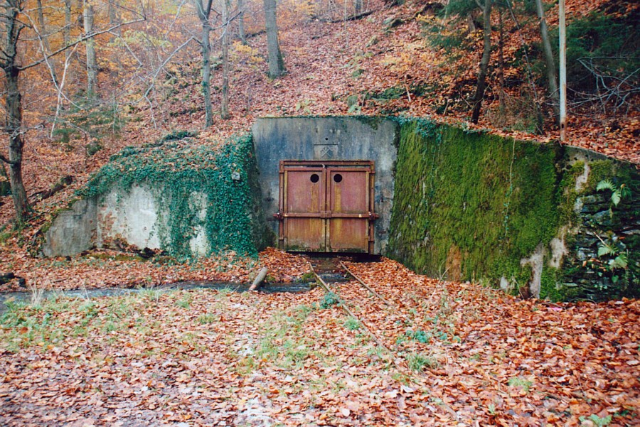 – Das Mundloch des Münsterstollens an der Landstraße Langhecke – Aumenau. Das Gleis der Grubenbahn liegt noch (bzw. wurde erneuert); das aus dem Stollen ausfließende Wasser wird nach links in einen Teich abgeleitet.