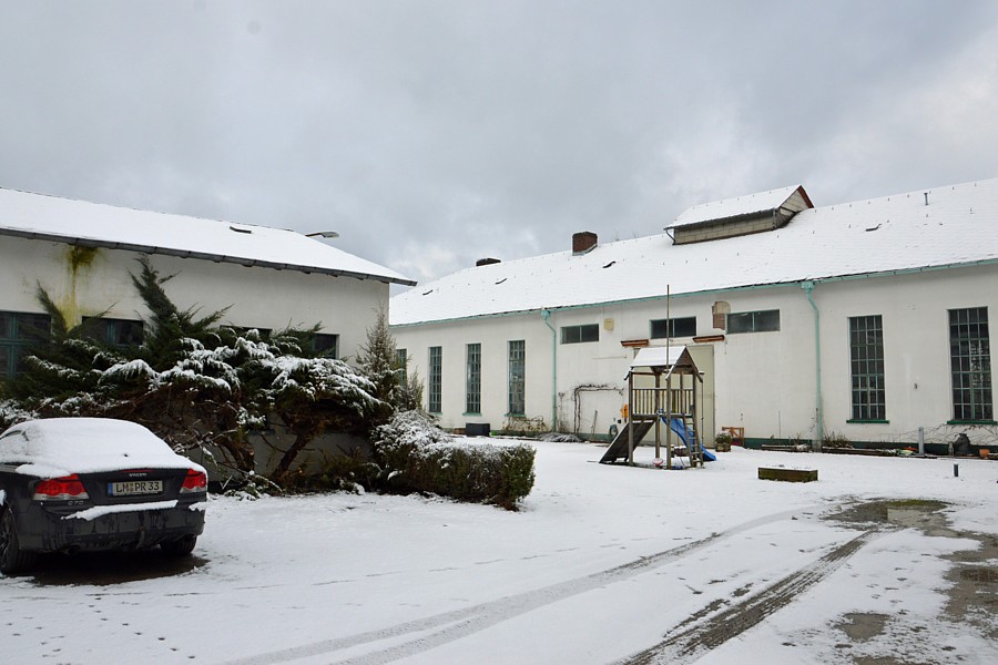 Das Zechenhaus von Süden. Im Bereich der drei kleinen Fenster vor dem Dachaufsatz stand, teilweise in das Gebäude