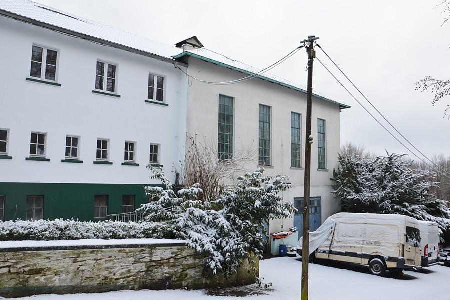 – Die Ostseite der Waschkaue, ebenfalls mit großen Fenstern ausgestattet. Links schließt das Verwaltungsgebäude an.