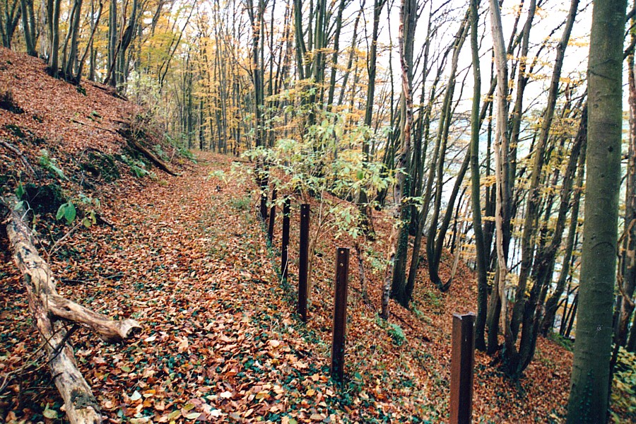 – Die Trasse der 600-mm-Schmalspurbahn am Steilhang hoch über der Lahn; Die Feldbahngleisstücke trugen einst ein Geländer.