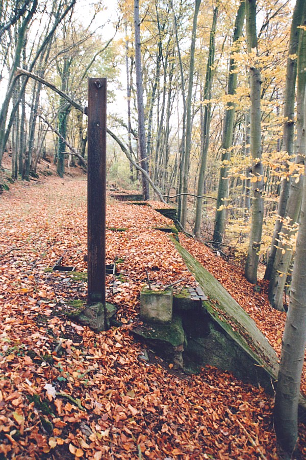 Gittern abgedeckten Bunker, über die das Erz zu Tal gebracht wurde. Der aufrechte Eisenträger im Vordergrund dürfte