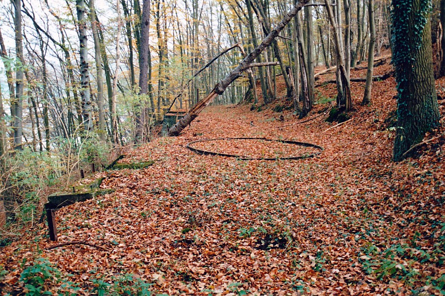 ![]() Bild III.6 – Die Verladeanlage (in entgegengesetzter Richtung wie Bild III.5). Die beiden halbkreisförmigen Schienen in der Mitte (eine dritte liegt rechts am Hang) könnten einmal die Einfassung einer Waggondrehscheibe gewesen sein. (18. 11. 2001 – CK) |