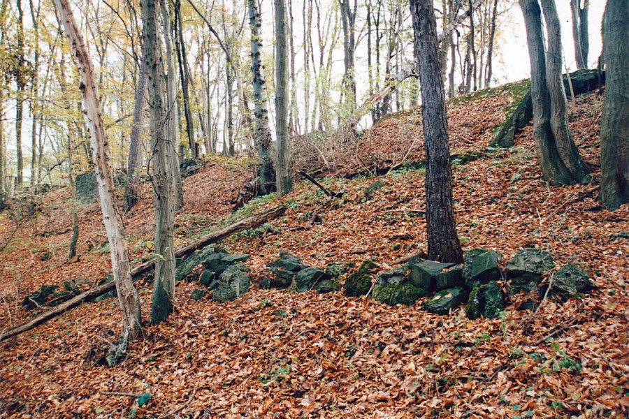 – Die Verladebunker vom Tal her betrachtet. Im Berg unter den Bunkern verläuft der Stollen, über den das Erz abgezogen und zum Sturzgerüst weiterbefördert wurde.