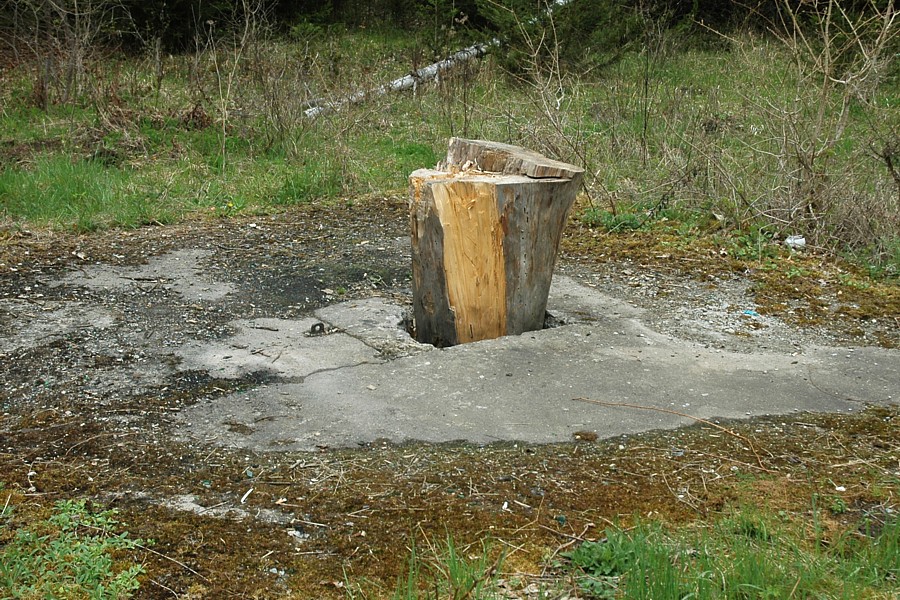 Unter dieser Betonplatte liegt die Öffnung des Maschinenschachtes, der Baumstamm ist offenkundig eine besonders