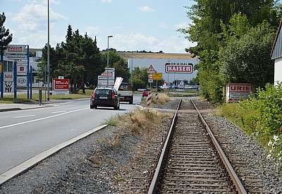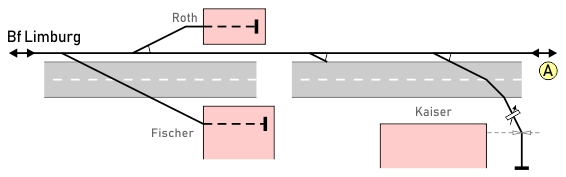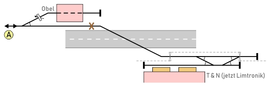 Kaiser-Anschlussgleis ist nur noch die Weiche übrig; hinter dem Anschluss Obel ist das Stammgleis durch ein Schwellenkreuz