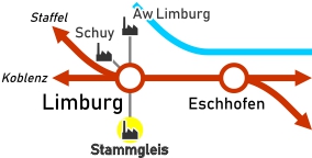 In den siebziger Jahren – einer Zeit also, in der Schienengüterverkehr schon ziemlich unmodern geworden war – erschlossen die Nachbarstädte Diez und Limburg ihr Gewerbegebiet südlich vom Limburger Bahnhof durch ein kommunales Anschlussgleis (Stammgleis), das am Westkopf des Bahnhofes ansetzt und entlang der Industriestraße in einem weiten Bogen nach Osten führt. Eine Besonderheit besteht darin, dass nicht nur Gebiet zweier Städte erschlossen wird, sondern dass das Stammgleis dabei auch noch die Landesgrenze zwischen Rheinland-Pfalz und Hessen überquert. In guten Zeiten wurden bis zu sechs Anschließer gleichzeitig über die Bahn bedient; nach einem starken Rückgang und der zeitweiligen Sperrung des Gleises im Jahr 2003 hat die Nutzung des Anschlussgleises inzwischen wieder zugenommen. Wichtigster Kunde ist seit Jahren die Spedition Obel Logistik International, die u. a. seit 2003 in den aus Italien zurückkehrenden Tonwagen palettierte Keramikerzeugnisse umschlägt. In den Jahren 2013 und 2014 wurde das Stammgleis im Zuge des Ausbaus der Industriestraße saniert und ein Großteil der alten, teilweise stark beschädigten Schwellen ausgetauscht.