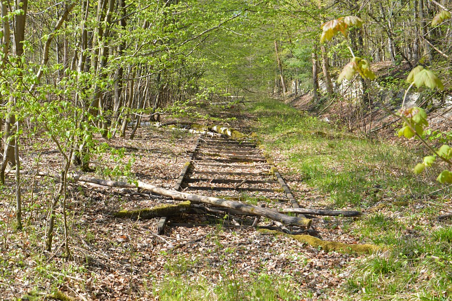 ![]() Bild 4 – Die gleiche Stelle wie Bild 3, rund 20 Jahre später; der Wald erobert das Gleisbett zurück. Ob die zwei Äste zufällig wie ein Schwellenkreuz dort hingefallen sind? (18. 4. 2015 – CK) |