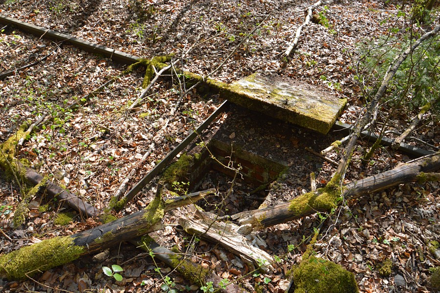 In regelmäßigen Abständen finden sich zwischen den Schienen des Anschlussgleises solche kleinen gemauerten Schächte mit