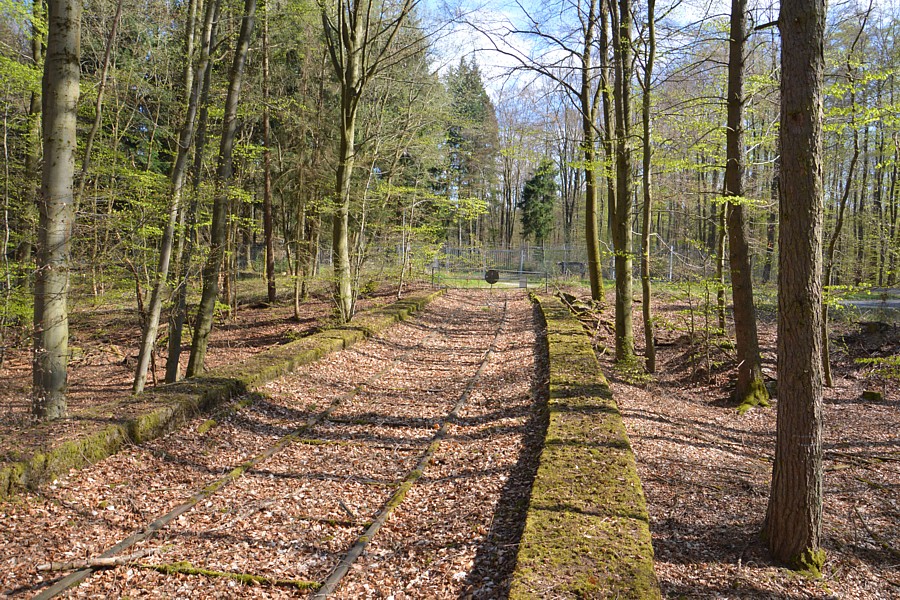 – Das Ende des Dammes, im Hintergrund das südliche Tor des Lagergeländes. Ein Gitter versperrt den Zutritt auf den Damm, dahinter quert ein Waldweg das Gleis.