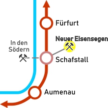 eingestellt. Ab 1929 ließ Krupp etwa 800 m südwestlich des bisherigen Standortes neue Tagesanlagen errichten (die in geradezu vorbildlichem „Recycling“ mit Gebäuden der aufgegebenen Gruben ![]() ![]() ![]() 1940 wurde der Betrieb auf Grube Neuer Eisensegen endgültig eingestellt, nachdem das stark zusitzende Grundwasser (bis zu 18 Kubikmeter strömten pro Minute in die Grube) einen wirtschaftlichen Betrieb unmöglich gemacht hatte. Auf dem Zechenplatz siedelte sich später die Firma „Scheu Fahrzeugeinrichtungen“ an, womit sich – zumindest dem Namen nach – der Kreis zum Anfang der Geschichte geschlossen hat. |