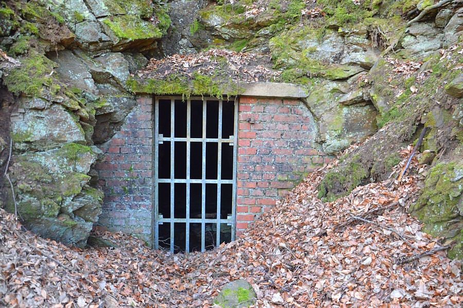– Die erneuerte Zugangstür des Stollens, ohne Flügelmauern direkt in den gewachsenen Fels gesetzt und beidseits mit einfachem Backsteinmauerwerk eingefasst.