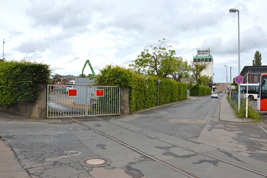 Das Bahntor zum Werksgelände befindet sich an der Ecke Schaumburger Straße/Rudolf-Schuy-Straße. Im Hintergrund ist der