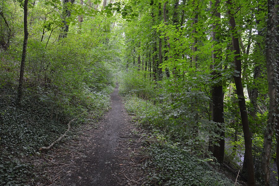 – Südlich der Haltestelle Obermühle verlief die Bahntrasse durch dieses Waldstück; hier etwa befand sich die Verladung von Grube Wrangel.
