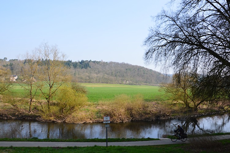 Der Blick vom Naturfreundehaus „Lahntalhaus“ (Wilhelmsmühle) bei Villmar über die Lahn zum Auerberg; am linken