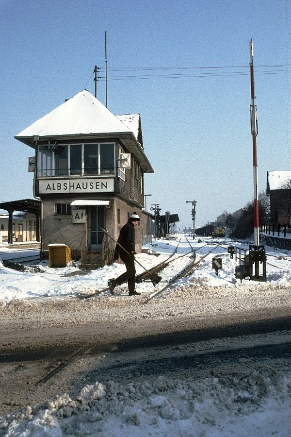Blick vom Bahnübergang der Bahnhofstraße. Direkt rechts vom Stellwerk ist das niedrige Ausfahrsignal mit Stummelflügel