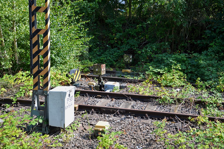 Der Blick geht vom Inselbahnsteig auf die stillgelegten Nebengleise, wo der Mast des Ausfahrsignals P501, ein