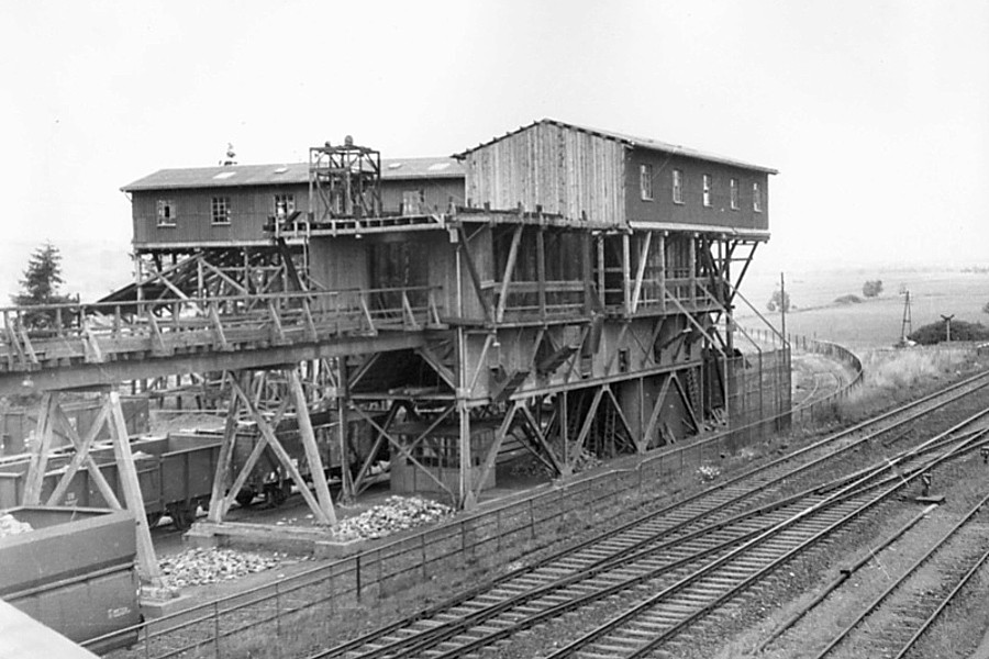 Die Verladeanlage von Südwesten; die oberste Ebene bildet die Endstation der (von links) von Grube Fortuna kommenden