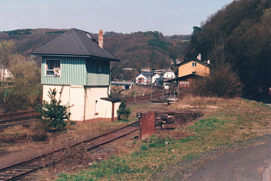 – Blick von der Rampe zum Stellwerk; im Hintergrund Empfangsgebäude und Güterschuppen, links davon die Lahnbrücke.