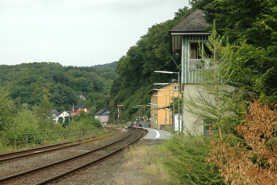 – Der Bahnhof Aumenau mit erneuertem Hausbahnsteig, Blick in Richtung Weilburg. Rechts vorn das Stellwerk, dahinter das Empfangsgebäude.