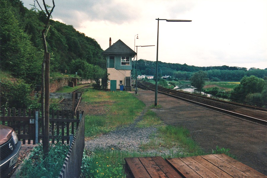 – Blick vom Güterschuppen zum Stellwerk; links dahinter die Stützmauer im Bereich der früheren Erzverladung.