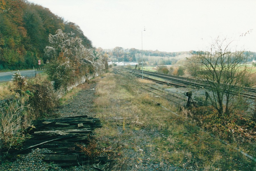 ![]() Bild 4 – Der gleiche Blick wie in Bild 3, jedoch fünf Jahre später (das Stellwerk steht rechts außerhalb des Bildes). Das Gleisfeld wuchert weiter zu, und die Zufahrtweiche zu den Gütergleisen ist ausgebaut worden. (18. 11. 2001 – CK) |