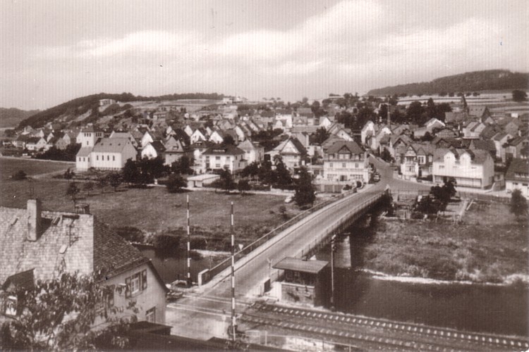 – Der Postkartenblick der früheren Siebziger zeigt den Bahnübergang an der Lahnbrücke noch mit dem Schrankenwärterhaus im Nachkriegsstil.