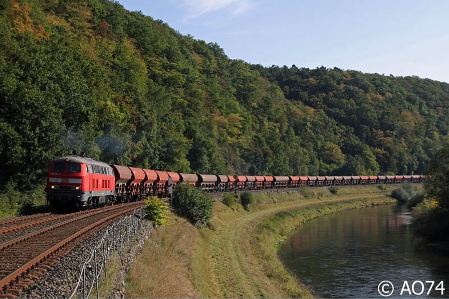 – Im September 2009 zieht eine Lok der BR 225 einen Güterzug aus wenigstens 30 F-Waggons aus Aumenau in Richtung Weilburg.