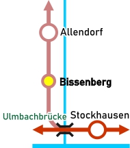 Norden wegzuschwenken. Bei km 4,4 lag, 800 m westlich des namengebenden Dorfes, der Haltepunkt Bissenberg. In den zwanziger Jahren bestand die Planung, den Haltepunkt zum Bahnhof auszubauen; das Dienstgebäude war bereits errichtet. Jedoch wurde das Vorhaben dann aufgegeben, da die meisten Fahrgäste – zumeist Pendler mit Ziel Wetzlar – besser über den gleich weit vom Dorf entfernten Bahnhof Stockhausen fahren konnten. Der Haltepunkt wurde noch in den vierziger Jahren geschlossen. Das Gebäude stand bis nach dem 2. Weltkrieg leer, dann wurde es abgerissen, da es Landstreichern und anderem unerwünschtem Volk Unterschlupf bot. Der Bahnsteig wurde 1963 bei der Gleiserneuerung beseitigt. |
