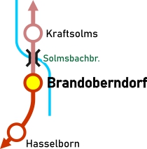 und erreicht gleich darauf den oberhalb des Ortes gelegenen Bahnhof. Der Bahnhof Brandoberndorf ist eine der (bisher?) wenigen Bahnstationen, die nach der Stillegung noch einmal zu „neuem Leben“ erweckt wurden; 1999 wurde von Grävenwiesbach aus das 4,5 km lange Teilstück der Solmsbachtalbahn bis Brandoberndorf wieder aufgebaut und wird seither von den Taunusbahnzügen bedient. Das imposante Empfangsgebäude hat allerdings ausgedient; der neue Bahnsteig kommt mit einer Wartehalle aus. |