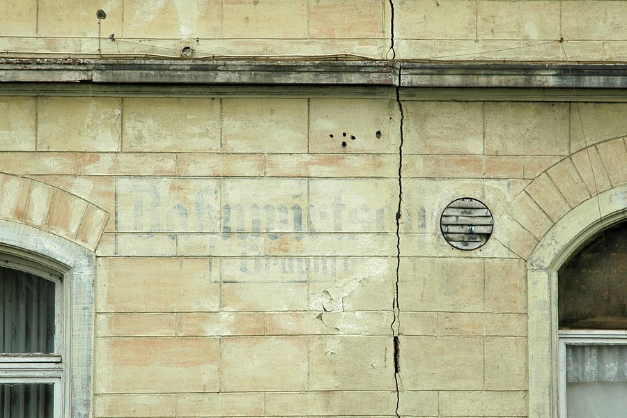 – Der Schriftzug „Bahnwirtschaft Braunfels“ an der Gleisseite ist nur noch mit Mühe zu entziffern. Der senkrechte Riss kennzeichnet den Übergang zum Anbau von 1907.