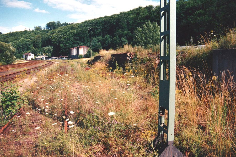 – Der hintere Bereich der früheren Erzverladerampe. Im Hintergrund links das stillgelegte Stellwerk „Bo“, rechts davon die Tanks des (zum Aufnahmezeitpunkt wohl schon ungenutzten) Privatgleisanschlusses.